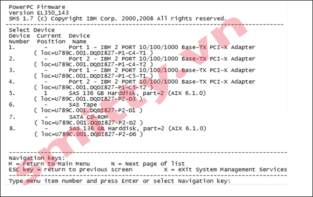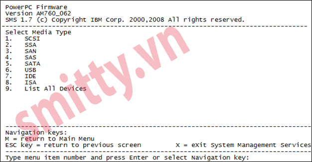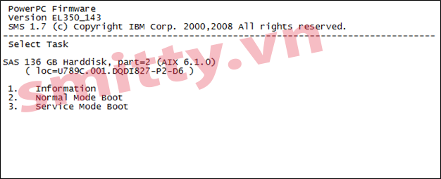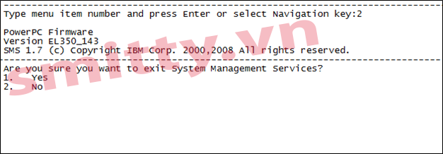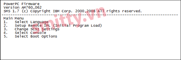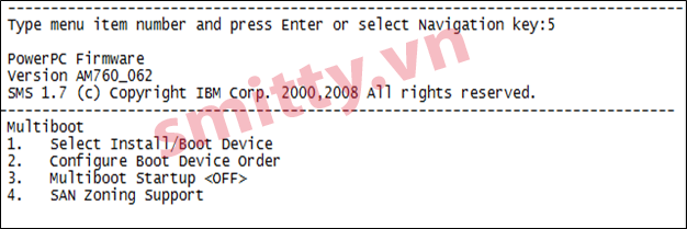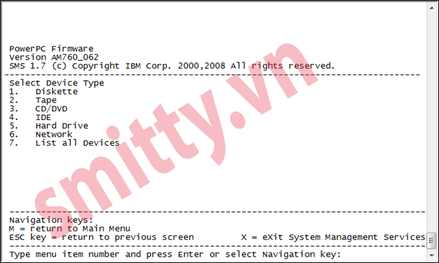 Boot server vào SMS mode. Từ màn hình HMC, sau khi power, ấn phím 1 (hoặc F1) liên tục tới khi vào được mà hình dưới đây: